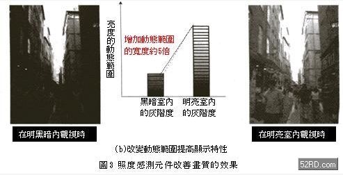 有you關guan液ye晶jing電dian視shi的de應ying用yong,主zhu要yao是shi液ye晶jing顯xian示shi器qi的de點dian燈deng時shi間jian越yue久jiu消xiao費fei電dian力li就jiu越yue大da,相xiang對dui的de散san熱re處chu理li與yu散san熱re風feng扇shan的de噪zao音yin則ze變bian成cheng非fei常chang棘ji手shou的de問wen題ti,尤you其qi是shi目mu前qian大da型xing液ye晶jing電dian視shi的de輝hui度du大da多duo超chao過guo時shi,在zai明ming亮liang室shi內nei畫hua麵mian非fei常chang的de亮liang麗li,不bu過guo在zai黑hei暗an室shi內nei卻que會hui出chu現xian波bo紋wen現xian象xiang,而er且qie畫hua麵mian太tai亮liang容rong易yi造zao成cheng眼yan睛jing疲pi勞lao,黑hei暗an色se影ying像xiang的de黑hei色se浮fu動dong現xian象xiang非fei常chang明ming顯xian,影ying像xiang對dui比bi則ze大da幅fu降jiang低di。由you於yu一yi般ban液ye晶jing電dian視shi是shi根gen據ju各ge畫hua素su的de液ye晶jing穿chuan透tou率lv,調tiao整zheng背bei光guang模mo組zu的de光guang線xian達da成cheng灰hui階jie化hua顯xian示shi目mu的de,然ran而er過guo多duo的de背bei光guang模mo組zu光guang量liang卻que有you漏lou光guang之zhi虞yu,如ru果guo利li用yong照zhao度du感gan測ce元yuan件jian偵zhen測ce液ye晶jing電dian視shi視shi聽ting環huan境jing的de亮liang度du,依yi此ci調tiao整zheng背bei光guang模mo組zu的de輝hui度du,除chu了le影ying像xiang黑hei色se浮fu動dong之zhi外wai,灰hui階jie數shu相xiang同tong的de條tiao件jian下xia還hai可ke以yi縮suo小xiao亮liang度du的de動dong態tai範fan圍wei(dynamicrange),進而提高黑色影像表現能力(圖3(b)),並降低最大輝度解除影像太亮的困擾,這意味著觀賞液晶電視時,消費者不會受到視聽環境的影響,隨時可以獲得細膩的影像。