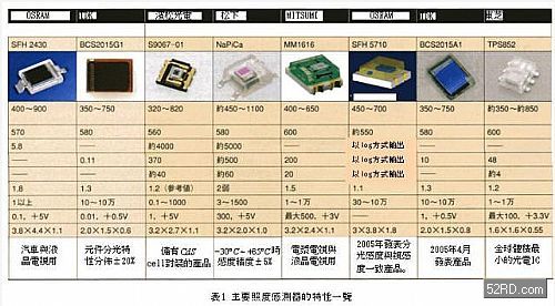 圖9是濱鬆光電(photonics)dexinxingzhaoduganceyuanjian,gaiyuanjiankeyijiangzhaodudaxiaozhuanhuanchengmaichongzhen盪pinlvxingshideshuchuxinhao,gaigongsitongshituichukeyigaibianmaichongkuandu,erqiekeyizhijieyuweichuliqilianjiedezhaoduganceyuanjian;OSRAM推出可以輸出對數顯示光電流,而且操作非常方便的照度感測元件,該元件計劃應用在汽車儀表等領域;東芝則開發起動時間縮短至1/5的新型照度感測元件。