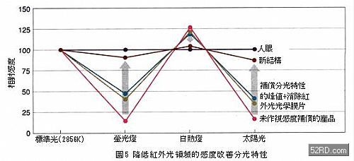 由於廠商對分光特性非常重視,因此分光特性的開發競爭也最激烈。如表1suoshimuqianshangpinhuadezhaoduganceyuanjian,tadefenguangtexingfengzhidayueshi,xiangdangjiejinrenyandeshigandufengzhi,buguosihuhaiwufamanzushichangdexuqiu,zhuyaoliyoushisuizheyingguangdeng、白熱燈、taiyangguangdengguangyuandebutong,shuchuguangdianliuhuichuxianjidachayi,lirubairedengdeshuchuguangdianliushiyingguangdengdebei,jiashangxianshiqidehuiduyurenyanganshoudeliangduyouchayi,yincizaibutonghuanjingxiajingchangyinweiguangyuandechayiwufahuodeyuqixiaoguo。zaochengshangshuxianxiangzhuyaoyuanyinshigeguangyuandefaguangpinpuchayijida,jiashangzhaoduganceyuanjianjubeirenyanwufaganceziwaiguangyuhongwaiguangdegandu,yincideguoOSRAM推出具備適合人眼視感度,而且分光特性峰值含蓋短波長到長波長範圍的照度感測元件;OSRAM表示,光源造成該元件的輸出電流差異可望低於以下(圖5)。