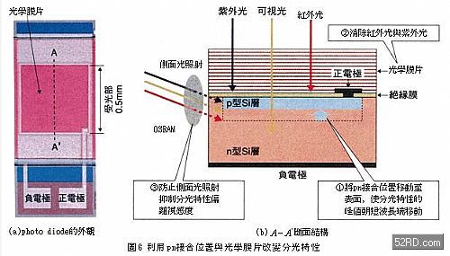 如圖6所示,分光特性可透過照度感測元件結構上的改良獲得調整,基本上它是改變的接合位置(吸光產生電力),同時配合分光特性的峰值利用光學濾光片(filter)去除紫外光與紅外光。新日本無線根據上述動作原理進行分光特性最佳化設計,再以光罩(mask)遮斷從光二極管側麵入射的光線,藉此捨棄光學濾光片傳統結構;德國OSRAM則採用新材質與新結構,未使用傳統的改善對策,大幅提升照度感測元件的分光特性。