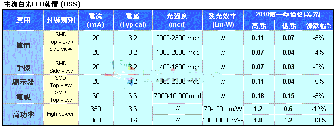 而在照明應用的高功率LED部分,則由於亮度在70-90lm/W的供給增多,加上照明市場明顯增溫,廠商為擴展市場佔有率,2010年Q1的照明用LED價格跌幅明顯大於背光用LED的價格。