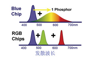 一般而言,小型LCD顯示屏背光照明都是用一組白光LED來實現的。可是,使用白光LED的問題是其光譜對光複製並不是很理想。原因是白光LED其實就是在藍光LED麵上加上一層黃色磷光劑。這樣便造成光譜有兩個波峰,一個在藍色而另一個在黃色。圖3給出一個典型的白光LED與RGBLED光譜比較。