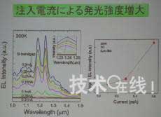 另外,該元件還呈現出如果增加注入電流、發光強度就會大幅提高的傾向,因此丸泉表示,“如果通過光子結晶形成共振器構造,就應該會產生激光振蕩。今後計劃將發光波長變更為可用於通信的1.5μm頻帶。將在2~3年後開發出作為光開關工作的元件,並實現實用化”。