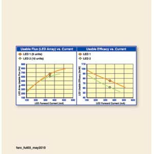 由於LED1的高熱/冷因數,9個LED1的總光輸出比10個LED2高出50lm。盡管在25℃時,LED1的額定光通低於LED2,但在350mA的電流驅動下,其性能要超過LED2。圖3(左)顯示了LED1在任何前向電流的驅動下,都比LED2高出100mA。圖3(右)顯示了在同樣的電流驅動下,LED1的效能要高過LED2。