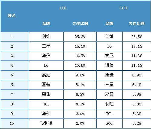 2010年5月,在中國LED背光液晶電視市場三星超越了海信成為關注亞軍,5個國外品牌在中國LED背光液晶電視市場的累計關注比例達到45.2%。此前阻礙國外品牌LED背bei光guang液ye晶jing電dian視shi發fa展zhan的de主zhu要yao因yin素su即ji為wei相xiang對dui高gao昂ang的de價jia格ge,而er目mu前qian眾zhong多duo國guo外wai品pin牌pai也ye已yi經jing加jia入ru到dao價jia格ge戰zhan中zhong來lai,通tong過guo直zhi接jie降jiang價jia或huo提ti供gong豐feng厚hou贈zeng品pin的de方fang式shi來lai搶qiang奪duo市shi場chang份fen額e。
