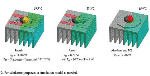 將熱點的溫度降低6k意味著可顯著減少LED的壓力。相同形狀Rubalit組件的總熱阻至少比鋁要好13%。使用Alunit可將CeramCool性能提升最少31%。如果考慮28K的熱降,則Rubalit和Alunit這兩種陶瓷材料帶來的實在的好處更要顯著得多。