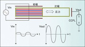CCFL通常作為筆記本電腦和便攜電子設備的彩色液晶顯示(LCD)的背景光源,CCFL是目前最高效的顯示器背景照明光源。由於運行CCFL需要高交流電壓,所以需要高壓DC/AC逆變器。基於PZT的逆變器可以提供正弦輸出電壓,這非常有助於減小RF輻射。RF輻射可能幹擾其它電子設備,並可能降低整個係統的運行效率。另外,基於PZT的逆變器所產生的正弦激勵還可以在CCFL中產生最優的電流到光的轉換效率。CCFL的工作電壓比其它光源的電壓要高很多,通常需要300到800伏交流電(取決於燈的長度),但整體功耗非常低。