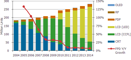液晶仍是全球電視的領導技術,幾乎所有地區的市占率都超過50%,預計亞太地區的比重也將於2010年底超過50%。2010年有幾項因素持續推動電視需求,包含世足賽,西歐地區幾個國家完成了數字電視的轉換,同時幾項新的電視技術,包括LED背光液晶電視、3D電視以及連網電視等都將帶動電視市場。