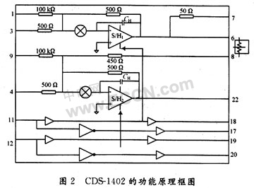 在CCDdeyingyonglingyuzhong。xiangguanshuangcaiyangdianludedaoleguangfandeyingyong。henduogongsizhuanmenyanfalexiangguanshuangcaiyangdejichengdianluxinpian。zhexiezhuanyongxinpianbujinshiyongfangbian,qiexingnengyenengdedaohendadetigao。CDS1402芯片是一種典型的相關雙采樣電路芯片,它是專門為CCD成像器件研製的,用來消除複位噪聲。CDS1402進行了優化,適合用於10~14位轉換精度的數字視頻。低噪聲的CDS1402芯片也是利用對高低電平信號的采樣並相減來精確確定視屏信號的。結果在CCD輸出的浮動電容器上,那些剩餘電荷和kTC噪聲被最大限度的消除。CDS1402芯片一共有24個引腳。它包含有2個獨立的采樣保持放大器和S/H電路,每個S/H電路都有獨立的控製線,輸人和輸出管腳,有兩個管腳提供偏置調流和調壓。一般來說,CCD的輸出信號都要連接到2個S/H的輸入端,S/H1端用來采集和保持偏置信號,它的輸出值與CCD輸出信號相減,當CCD輸出偏置+視頻信號的時候,S/H2端就進入信號的采集狀態,從而獲得有用的視頻信號。