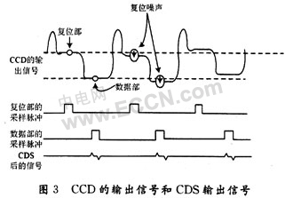 從圖3可以看出,當複位部脈衝是高電平的時候。CCD的輸出信號進行第1次采樣,采樣信號為複位電壓、複位失調電壓和複位噪聲;當數據部脈衝是高電平時,CCD的輸出信號進行第2次采樣,采樣信號除包括複位電壓、複位失調電壓和複位噪聲外,還包括有用的視頻信號。