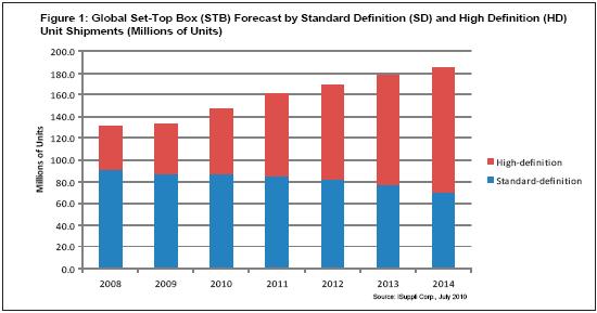 高清STB的出貨量最近幾年保持快速增長。2009年,高清STB出貨量增長600萬個以上,從2008年的3910萬個增長到4520萬個。到2012年,高清STB出貨量將首次超過標清(SD)STB。到2014年,高清STB將達到1.14億個,複合年度增長率為20.3%。
