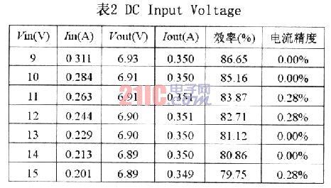 表2為輸入用直流電源,電壓範圍9~15V,從表中可以看出Iout幾乎不因輸入電壓不同而變動,效率為79.75~86.65%,電流精確度0.00~0.28%。(表2的數值是用1WLED量測)