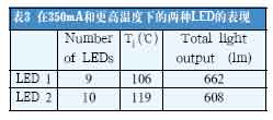 在數據表描述的25℃結溫和350mA的前向電流下,LED2的性能比LED1要好。但是,更實際的比較將在更高的結溫下進行(見表3)。
