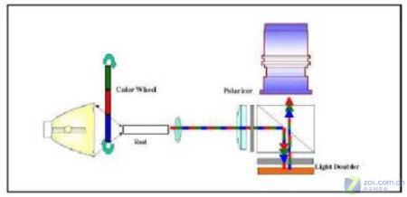 單片式ColorWheel光學引擎則是以快速旋轉的ColorSwitch將白光形成循序的紅、藍、綠光,並將三原色光與驅動程式產生的紅、藍、綠畫麵,同步形成分色影像,再藉由人眼視覺暫留的特性,最後在人腦產生彩色的投影畫麵。類似的技術有:Displaytech發表的FieldSequentialColor、Philip所采用的ScrollingColor-RotatingPrism架構、及JVC采用的SpatialColor–Hologram架構。[page]