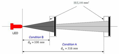 圖4中,點光源光強在空間各方向均勻分布,在不同距離處用不同接收孔徑的探測器接收得到的測試結果不會改變。但是,LED由於其光強分布不一致,使得測試結果隨測試距離和探測器孔徑而變化。因此,CIE-127提出了兩種推薦測試條件,使得各個LED在同一條件下進行光強測試與評價如圖5所示。目前,CIE-127推薦測試條件已經被各LED製造商和檢測機構引用。