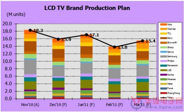 包括全球品牌三星和中國本土品牌康佳在內的前16家液晶電視品牌商每月生產總量已從2010年11月份的1千8百30萬台降到了2011年3月份的1千5百40萬台(如圖一)。同時,2011年第一季度生產總量預計為4千6百30萬台,比2010年第四季度降低了12%。