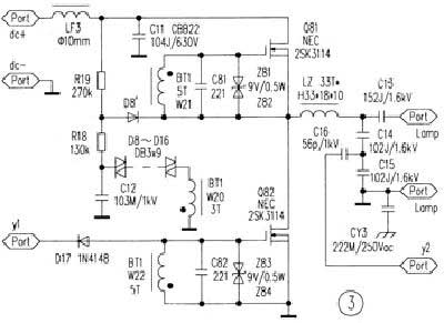 逆變電路如圖3,它將PFC電路輸出的高壓直流變換為供無極燈使用的高頻交流電。國際電工委員會CISPR15允許對磁場感應標準的頻率範圍為2.2MHz~3.0MHz,其中心頻率為2.6MHz。接通電源後PFC輸出直流電壓.通過R19、R18加到電容C12上,C12開始充電。當C12上所充電壓達到觸發管(DI-AC)D8~D16的轉折電壓時,DIAC由關斷轉為導通狀態。積分電容C12所儲存的電荷經DIAC加於振蕩變壓器BT1的初級繞組W20,依靠W22、W21兩個繞組使Q81、Q82獲得幅度相等,相位相差180°的驅動信號。在Q82導通時Q81被強迫關斷截止;Q81導通時,Q82又被強迫關斷截止。