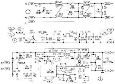MC33262是一款可靠且成本低廉的功率因數校正芯片,其應用電路如圖2所示。市電經電源濾波器和整流器得到脈動直流電。電流通過啟動電阻R10向C2充電至10V時,IC1開始工作。整流後的直流脈動電壓在R5的分壓作為取樣信號經IC1的③腳輸入乘法器。直流輸出電壓在R6和WR上的分壓經①腳輸至誤差放大器的反相輸入端,與2.5V的參考電壓比較放大後輸出一個直流誤差電壓,同時也輸入到乘法器。
