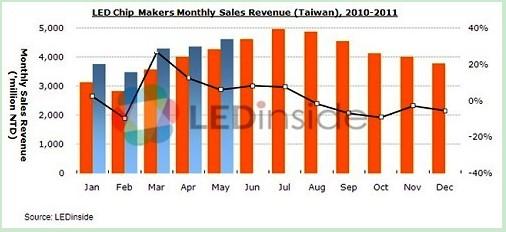 近日消息,據統計,2011年5月台灣上市上櫃 LED 廠商營收總額約新台幣99.57億元(月成長5.8%、年成長8.3%)。