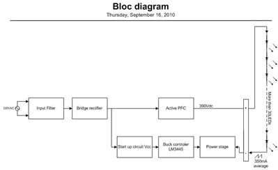 該電源的主要目的是將整流AC輸入轉換為DC穩壓電流,以下是一個優化示例,示意在350mA電流下如何驅動功率達到35W的30個高亮度白光LED。該電源為LED提供了保護,限定了瞬態輸入電壓,並在熱插拔時避免了電流浪湧。總的電源一致性(電源母線諧波(EN),電源母線幹擾,國際安全標準等)全部符合歐洲標準(EN)。