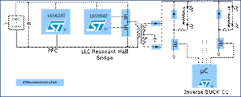 電源電路的最大輸出功率達到130W (48V,2.7A),該電路由兩級電路組成:基於L6562AT的前端功率因數校正器(PFC)和基於L6599AT的LLC諧振轉換器。