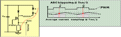 在這個架構內有一個與PWM周期中心對準的三角形載波,當達到最大計算值時,該三角形載波利用TRGO信號觸發模數轉換器,這個最大值正好是導通時間(Ton/2)波形周期的中間。