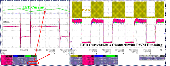 圖3:a) LED電流(綠色波形)和並聯變阻器上的電壓(紫紅色波形); b) LED燈串上的均流控製