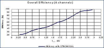 為了全麵地分析采用反向降壓轉換器拓撲實現的數字電流控製器,圖4對能效與電流負載進行了對比分析。在全負載時,四條通道可實現 97%的總能效,這可滿足主要的節能要求。