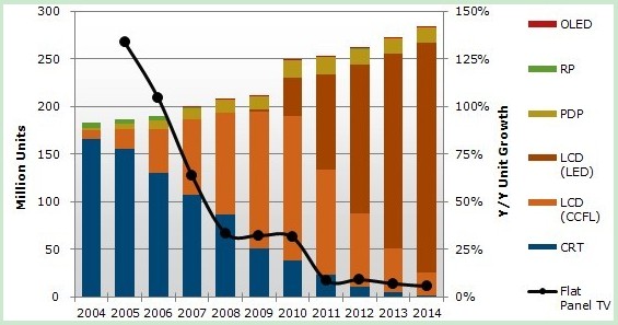 液晶電視市場份額持續上升,目前占比為84%.出貨量預計將由2010年的1億9千2百萬台上升到今年的2億1千萬台。但低於原先預期的2億1千7百萬台,這也直接導致全球電視總出貨量減少。