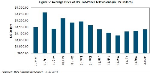 據IHS iSuppli公司的報告:“Price Gap CONTInues between Active vs. Passive 3-D LCD TVs”,由於價格較高的主動3D液晶電視供應增加,美國平板電視價格6月份連續第三個月上漲。