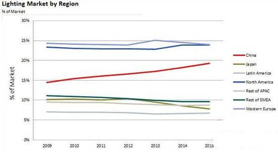 經濟發達地區比如北美和歐洲將會是照明市場增長的主要區域,將會占到50%左右的市場份額($US)。2010年,中國占到全球照明市場的14%,2015年預計會增至20%。持續的經濟增長,建設熱潮,對於電力消耗增大的擔憂以及公眾購買能力的提升會影響該區域的市場。