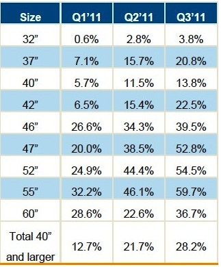 DisplaySearch指出,3D 麵板優點隨熒幕尺寸增大更加明顯,因此3D液晶電視麵板滲透率隨著尺寸越大而比重越高;3D液晶電視麵板在40寸級以上的滲透率從第一季的12.7%成長到第二季的21.7%,電視麵板廠商目標是在第三季達到28.2%的滲透率。