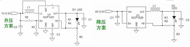 圖3:基於NCP1421的升壓型和基於NCP1529的降壓型1-3 W手電筒LED應用