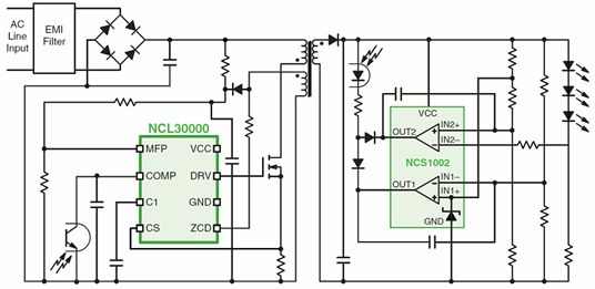如前所述,為低功率LED照zhao明ming應ying用yong選xuan擇ze適shi合he的de驅qu動dong器qi須xu考kao慮lv眾zhong多duo因yin素su,這zhe其qi中zhong,有you關guan功gong率lv因yin數shu等deng行xing業ye標biao準zhun尤you為wei重zhong要yao。接jie下xia來lai,我wo們men將jiang以yi安an森sen美mei半ban導dao體ti的de幾ji款kuan低di功gong率lvLED通用照明驅動方案為例,探討如何在低功率照明應用中提供高功率因數。