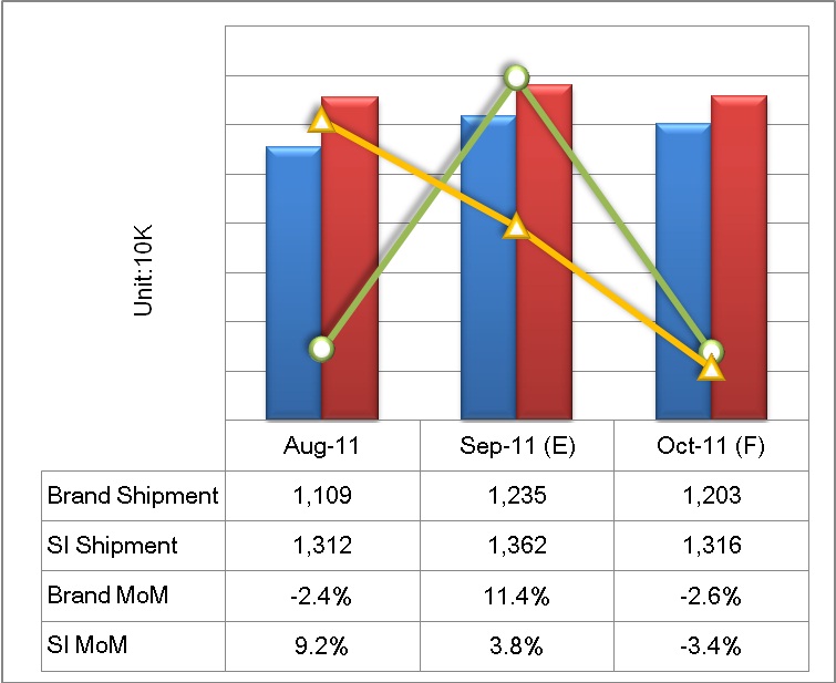 根據集邦科技(TrendForce)旗下研究部門WitsView全球前十大液晶監視器出貨調查顯示,前十大品牌廠商2011年8月在美係廠商因季初而導致出貨動能疲軟,加上終端消費市場需求依然平淡下影響下,MoM下滑至2.4%,為1,109萬台。一如WitsView預期,8月份SI陸續接獲第四季品牌短單及部分SI出貨從穀底攀升下,呈現較高幅度之月成長,達9.2%。展望SI第四季出貨,WitsView表示由於2012中國農曆年在一月下旬較往年為早,為因應中國新年假期而引起的缺工問題,部分第一季需求將提前在第四季反應,QoQ出chu貨huo將jiang呈cheng現xian小xiao幅fu成cheng長chang。展zhan望wang品pin牌pai九jiu月yue出chu貨huo,除chu了le季ji底di需xu衝chong刺ci出chu貨huo量liang及ji部bu分fen區qu域yu的de教jiao育yu市shi場chang訂ding單dan釋shi出chu外wai,品pin牌pai廠chang商shang亦yi摩mo拳quan擦ca掌zhang為wei中zhong國guo十shi一yi長chang假jia銷xiao售shou準zhun備bei,因yin此ciWitsView預估九月將有9-12%出貨成長空間。