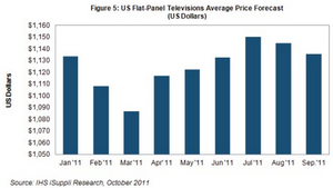 IHS公gong司si預yu測ce,電dian視shi轉zhuan播bo橄gan欖lan球qiu賽sai季ji,以yi及ji年nian底di假jia日ri銷xiao售shou季ji促cu銷xiao活huo動dong開kai始shi,預yu計ji未wei來lai幾ji個ge月yue電dian視shi價jia格ge將jiang會hui下xia降jiang,零ling售shou商shang可ke能neng出chu清qing庫ku存cun,準zhun備bei進jin貨huo2012年新款產品。在經濟不景氣之際,美國市場對價格仍然高度敏感,品牌廠商可能極其重視質量和創新,以此來打敗競爭對手。