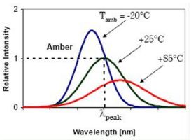 而且當溫度變化時,LED的發光光譜也會發生變化。通常溫度增加時光譜的最大值是向波長長的方向漂移。大約是每升高10oC時漂移1nm,升高50度會產生5nm的變化(見圖6)。