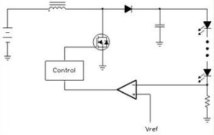圖中顯示了一個基本的電感升壓電路,其中控製器(Control)給出了一個PWMkaiguanxinhaolaikongzhidagonglvkaiguanguan,houzhezaidaotongshiduidianganchongdian,erzaiduankaishidianganzhongdenengliangjiuduidianrongchongdian。jingguojicikaiguanyihoujiukeyibashurudianyabengzhigenggaodedianya,congerwanchengshengyaderenwu。gaibianPWM信號的工作比就可以改變其輸出電壓。為了保持輸出電流的恒定,就要求測量輸出電流值,這是靠一個和LED串聯的小電阻來測量的。這個電阻上的電壓就和一個參考電壓相比較,比較所得出的誤差信號就送去控製器用以改變PWM信號的工作比,這樣就實現了一個閉環自動控製,以控製其輸出電流為恒定。