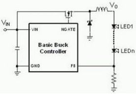 通常儲能電感是和LED串聯,開關導通時,電感儲能;開關斷開時電感通過二極管繼續有電流流通。由於輸出電壓是輸入電壓減去電感電壓,所以是降壓型。LED中的電流經過檢測電阻測量以後反饋回控製器。來控製PWM的工作比,以實現恒流的控製。