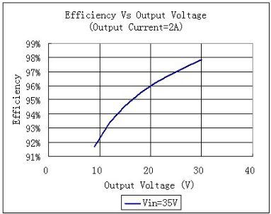 降壓型恒流源的缺點是要求輸入電壓高於輸出電壓,而太陽能LED路燈中所采用的蓄電池往往是12V,頂多是24V。而路燈中的LED通常是10個串聯,其所要求的總輸出電壓往往在33V-36V左(zuo)右(you),因(yin)此(ci)較(jiao)難(nan)采(cai)用(yong)降(jiang)壓(ya)型(xing)的(de)恒(heng)流(liu)源(yuan)。而(er)降(jiang)壓(ya)型(xing)恒(heng)流(liu)源(yuan)的(de)優(you)點(dian)是(shi)效(xiao)率(lv)高(gao)。因(yin)為(wei)輸(shu)入(ru)電(dian)壓(ya)高(gao)於(yu)輸(shu)出(chu)電(dian)壓(ya),所(suo)以(yi)輸(shu)入(ru)電(dian)流(liu)小(xiao)於(yu)輸(shu)出(chu)電(dian)流(liu)。電(dian)流(liu)小(xiao)有(you)助(zhu)於(yu)減(jian)小(xiao)電(dian)阻(zu)性(xing)損(sun)耗(hao)。圖(tu)15表明一個降壓型恒流源在輸入電壓固定在35V,輸出電流固定在2A時,其效率和輸出電壓的關係曲線。