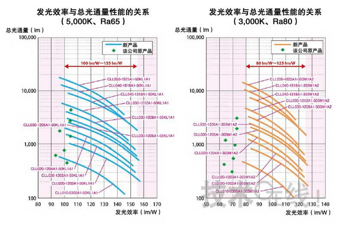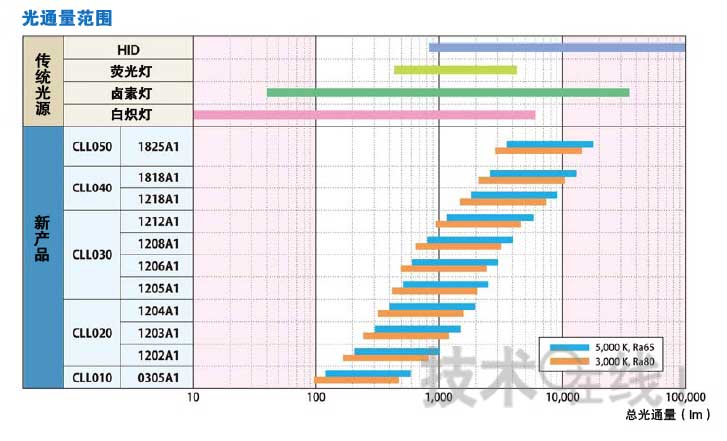 除了CLL-050係列外,西鐵城電子還發布了亮度最大分別為590lm、1970lm、5780lm以及1萬2915lm的不同封裝的4個係列。包括CLL-050係列在內的5個係列產品,覆蓋了95~1萬7675lm的亮度範圍,可以應對從10W白熾燈泡到300W汞燈的廣泛需求。