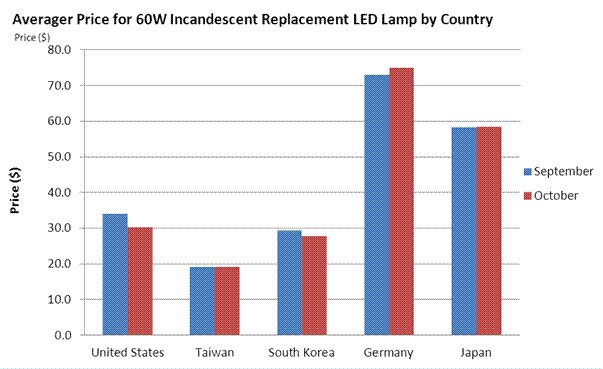 - 10月替代60瓦白熾燈的LED燈泡全球平均售價為36美元
