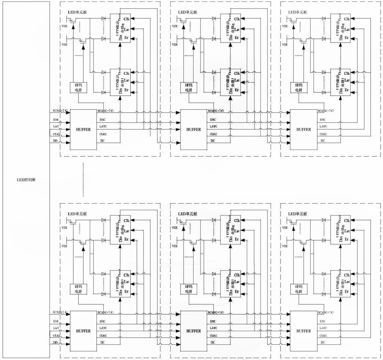 LED 控製板與LED 單元板構成的LED 顯示係統的主體,如圖1 所示。其中,LED 單元板包括了增強信號驅動能力的BUFFER 電路、產生動態顯示掃描時序的譯碼電路、若幹個開關管和若幹個LED 驅動電路。其通信過程為:LED 控製板發出的通信信號依次經過各串接的LED 單元板的BUFFER 電路進行驅動增強;各LED 單元板中經BUFFER 電路增強後的掃描信號(SCANO)提供給本LED 單元板的譯碼電路,譯碼電路譯碼產生動態顯示掃描時序控製開關管;各LED 單元板中經BUFFER 電路增強後的使能信號(ENO)、鎖存信號(LATO)、時鍾信號(CLKO)分別提供給本LED 單元板中所有LED 驅動電路。