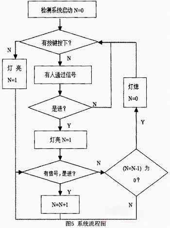 係統流程圖如圖5所示。其中N表biao示shi洗xi手shou間jian內nei現xian有you的de人ren數shu,當dang檢jian測ce係xi統tong電dian源yuan連lian上shang後hou,光guang電dian傳chuan感gan器qi開kai始shi檢jian測ce,但dan係xi統tong不bu知zhi道dao洗xi手shou間jian內nei此ci時shi是shi否fou有you人ren,默mo認ren是shi無wu人ren,因yin而er燈deng是shi不bu會hui亮liang的de,這zhe時shi按an鍵jian可ke以yi用yong來lai對dui係xi統tong進jin行xing調tiao整zheng。當dang光guang強qiang增zeng大da到dao一yi定ding值zhi時shi,檢jian測ce係xi統tong自zi動dong停ting止zhi工gong作zuo。