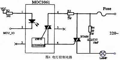 本係統由光電傳感器檢測洗手間內是否有人,單片機進行計數,當N不為零時,單片機會向與MOC3061芯片引腳相連的端口輸送信號,然後通過可控矽來控製燈的開、關。其中R3是雙向可控矽的門極電阻,當可控矽靈敏度較高時,門極阻抗也很高,並上R3可提高抗幹擾能力。 39Ω電阻和0.01μF電容組成浪湧吸收電路,防止浪湧電壓損壞雙向可控矽。其電路圖如圖4所示。