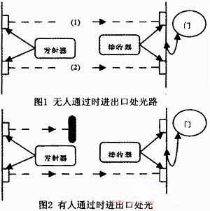 本係統中設計了兩個對射型光電傳感器,當有人通過時,若是光路(1)先檢測到信號,則表明此人是進洗手間,計數器加1,若是光路(2)先檢測到信號,則表明此人是出洗手間,計數器減1,即兩個對射型光電傳感器是用來檢測和判斷是否有人進出洗手間。