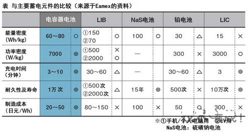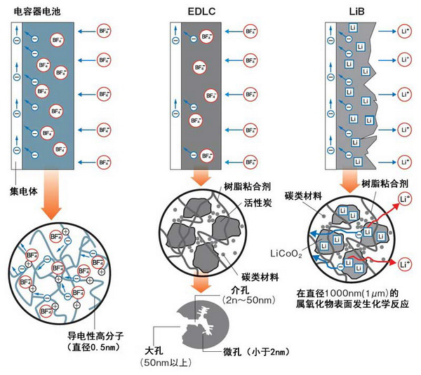 LIB的電子隨著正極中鋰金屬氧化物的化學反應而移動,因此充放電需要一定時間。而電容器電池或LIC是隨著離子的移動來交換電子的,因此反應很快。因而可實現幾分鍾~10分鍾左右的高速充放電。