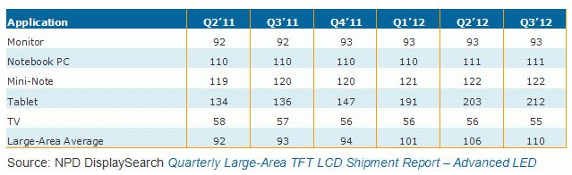 NPD DisplaySearch最新季度大尺寸TFT-LCD麵板出貨調查指出兩個趨勢,一是平板電腦用麵板持續往更高分辨率方向發展,二是低成本直下式LED背光麵板將逐漸成為TFT-LCD電視麵板另一主流。