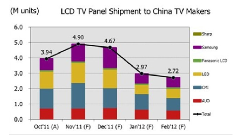 就總體液晶電視麵板出貨而言, 預估向中國大陸本土廠商11月出貨量較上月成長24%, 12月較11月下降5%; 而到2012年1月, 麵板出貨數量將大幅度下滑至不足300萬片, 較12月下降達到36%。