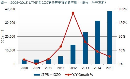 圖一、2008-2015 LTPS和IGZO高分辨率背板的產量 (單位:千平方米)